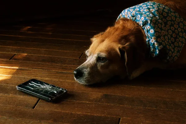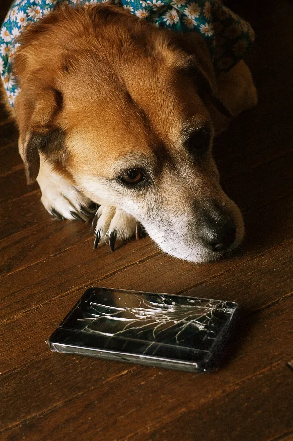 Just 2 feet from the floor, my poor phone wasn’t strong enough to withstand the impact. Our dog Brandy spent some time reflecting on the short life of this phone (plus she’ll pose for a picture when there’s a treat in her future)