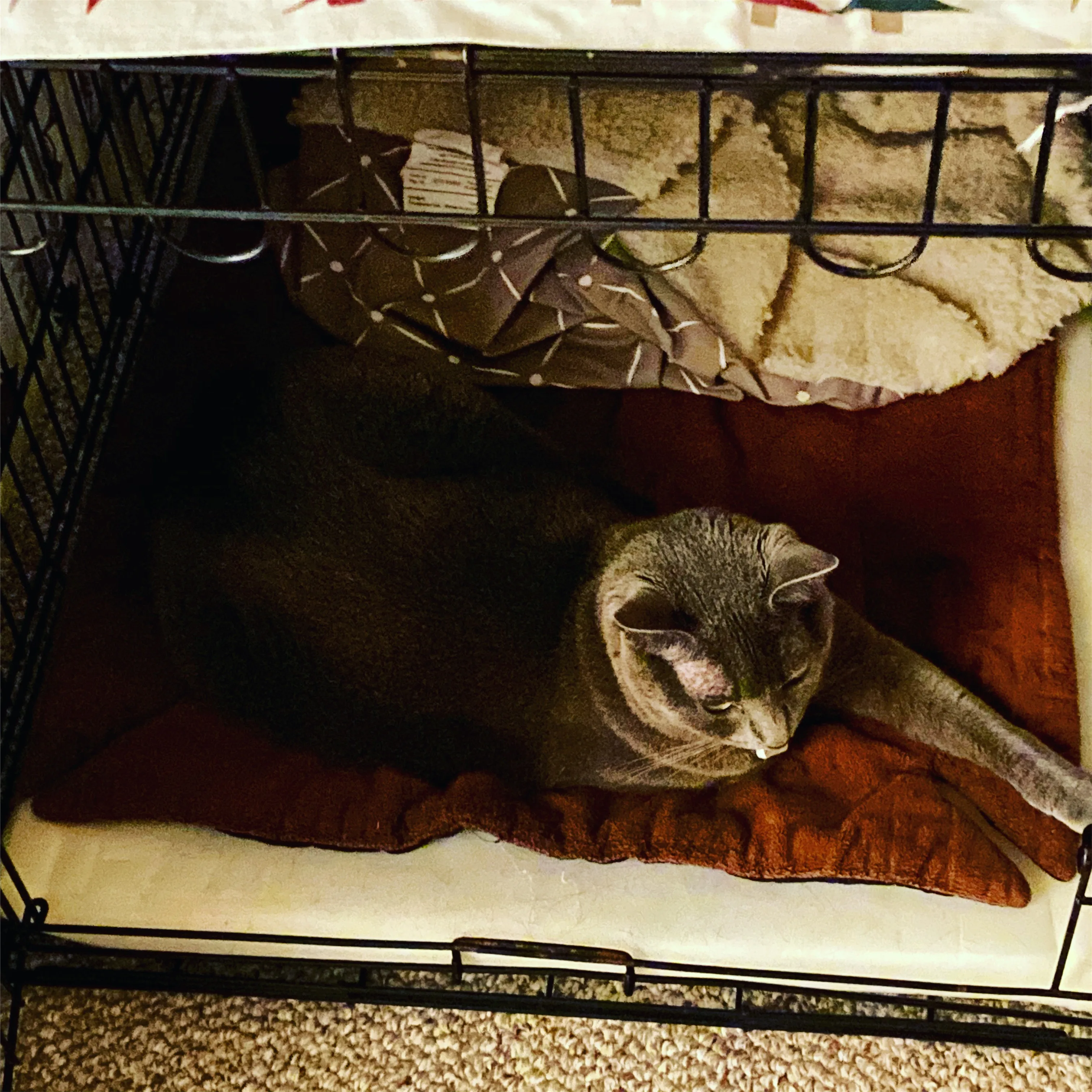 I very rarely close the door on the dog crate. Apparently in the middle of the night the dog moved to the floor and the cat decided she was a dog.