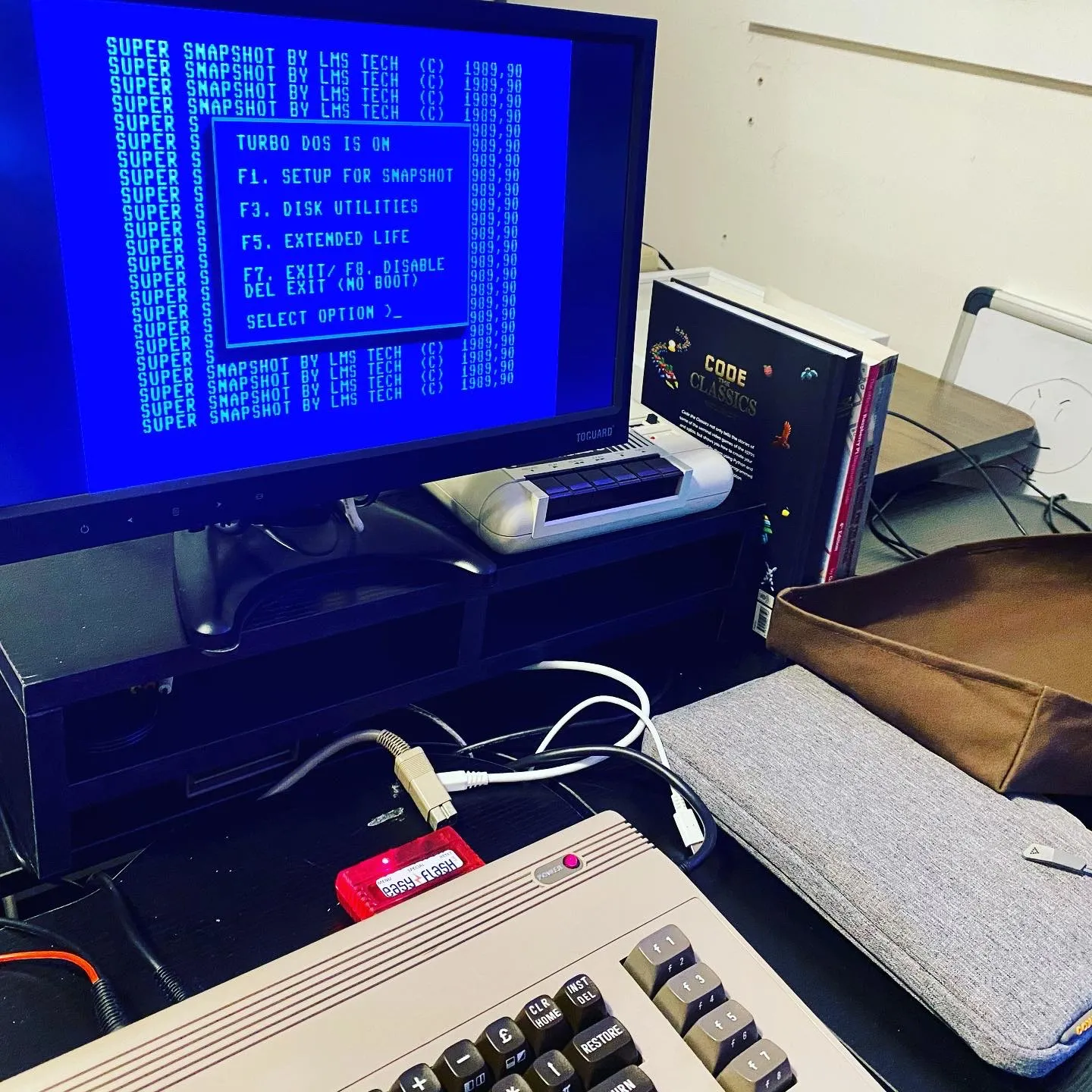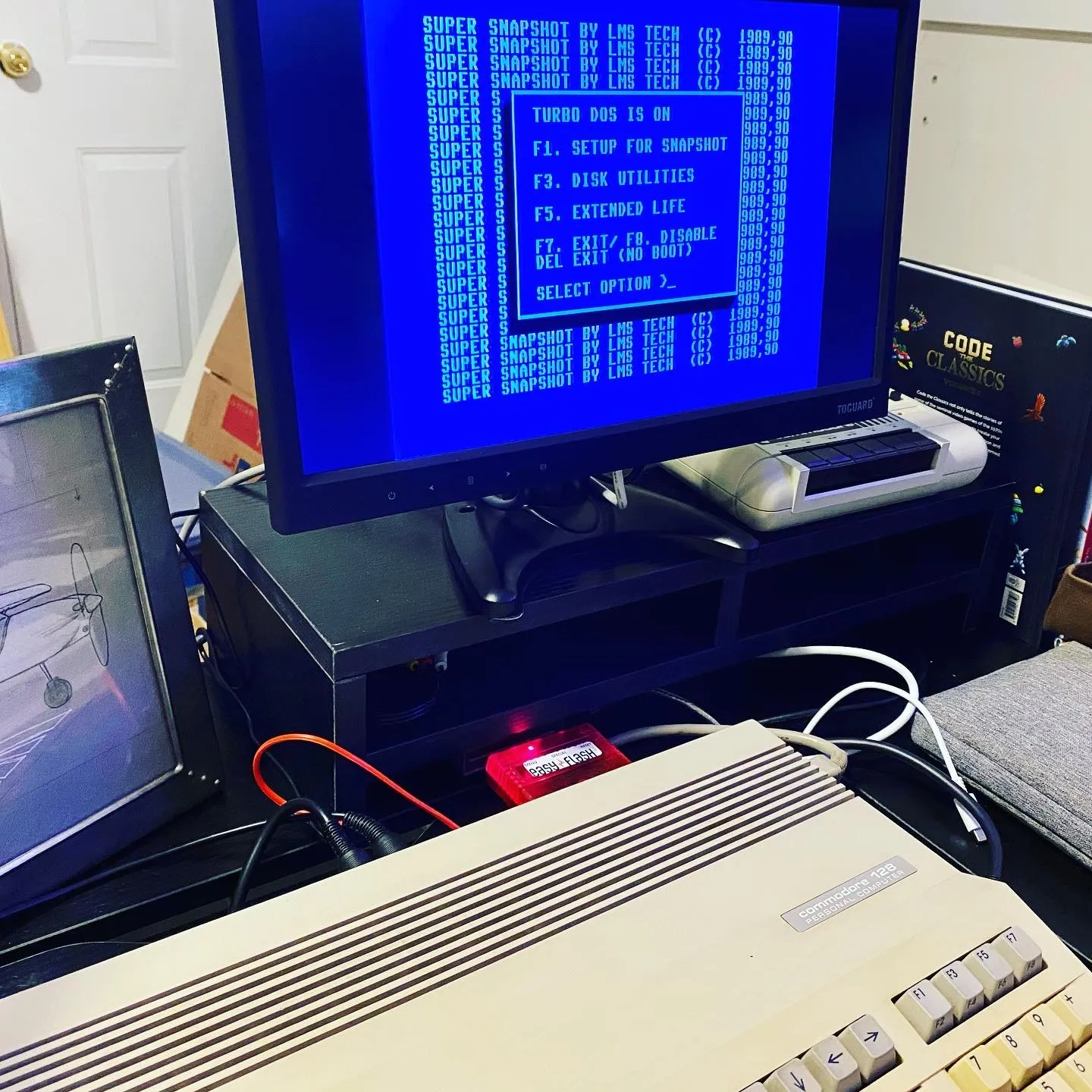 My quest for Super Snapshot on Commodore continues. Flashed it to an Easy Flash and it starts on both the 64 and 128 but is slow and crashes both systems.