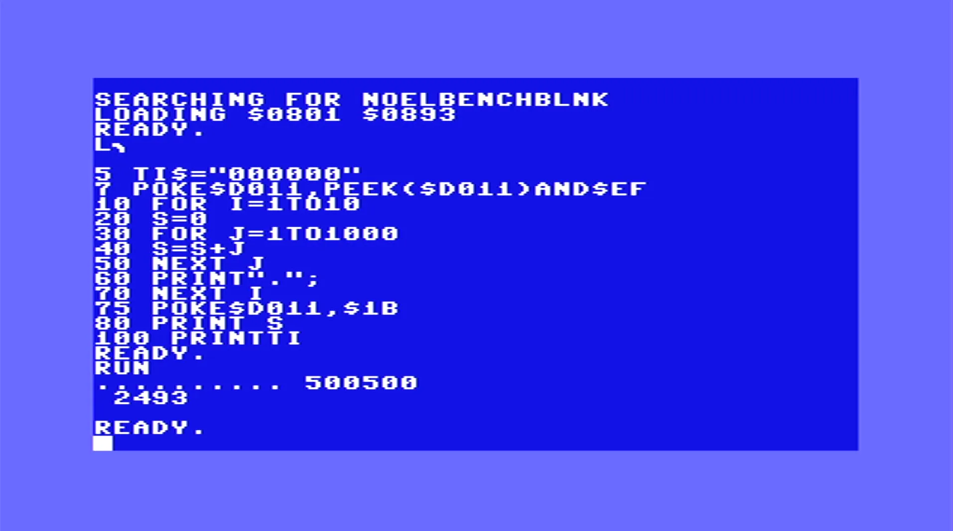 More C64 Badlines fun while on Zoom calls. Running @NoelsRetroLab benchmark with the screen on vs screen off (PAL). 2.4 seconds faster.