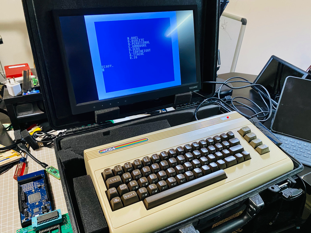 Fits in the case. Monitor and TheC64 are 5V. Both run off of a single split wall plug or a 10Ah battery. Need to design/3D print brackets(less foam please) and buy a right-angle HDMI connector. I can visit @gregnacu and his Ultimate portable in a cafe soon #commodore #c64