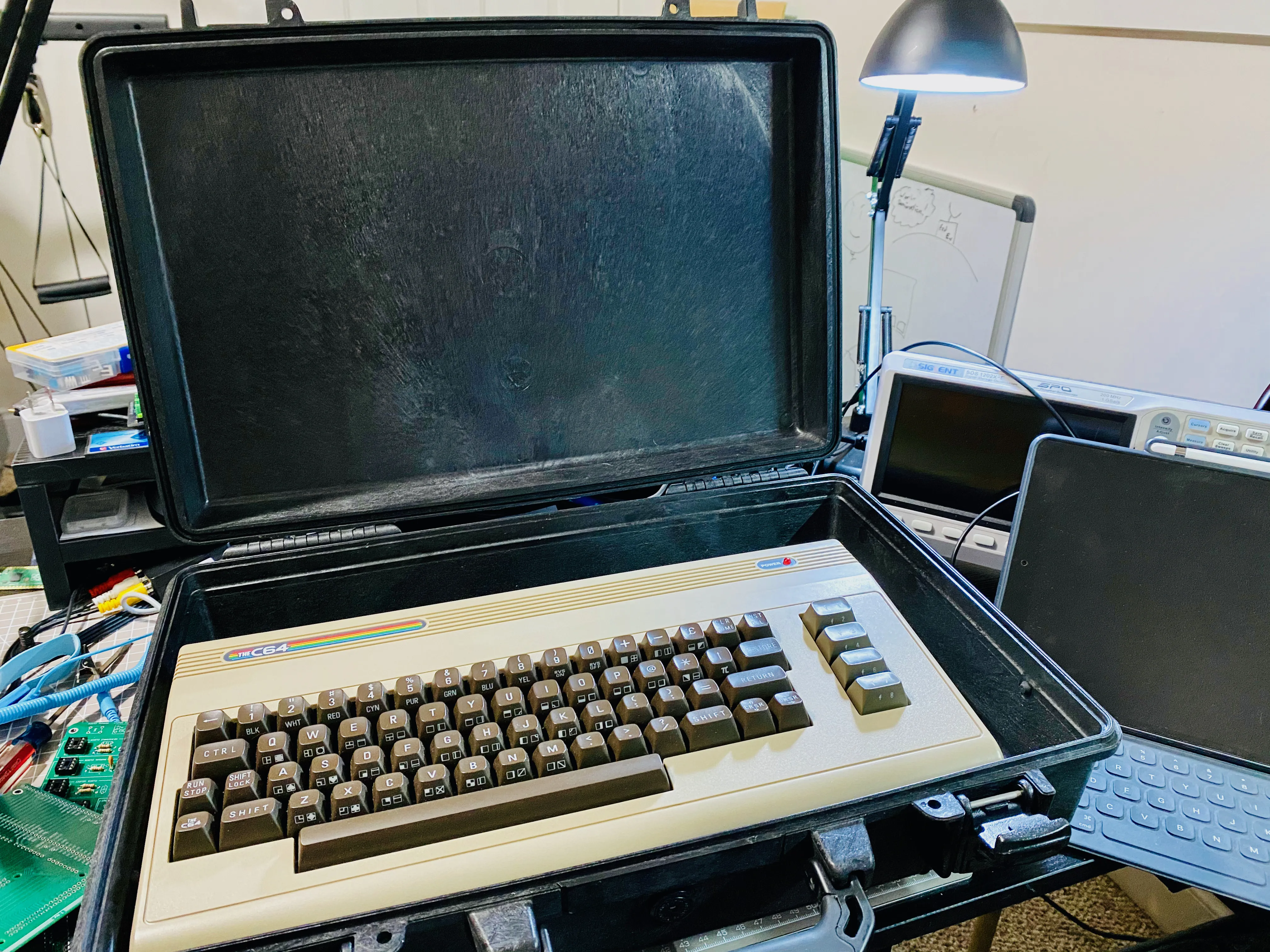 I've been trying to figure out what to do with my "TheC64". I have this pelican 1490 case and a 14" very thin monitor that will fit in the lid. I need some kind of mechanism to raise it up when it's open. Hmmm... #commodore #c64