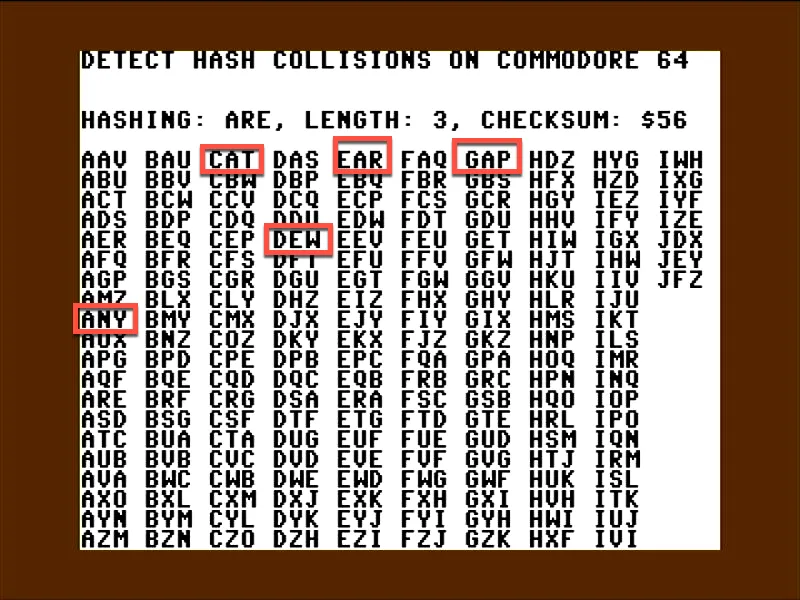 Getting into the nitty gritty of the crypto series on the Commodore now. I want to demonstrate hash collisions. Only 1Mhz so I'm doing shorter hashes and looking for occurrences of collisions that result in english words.