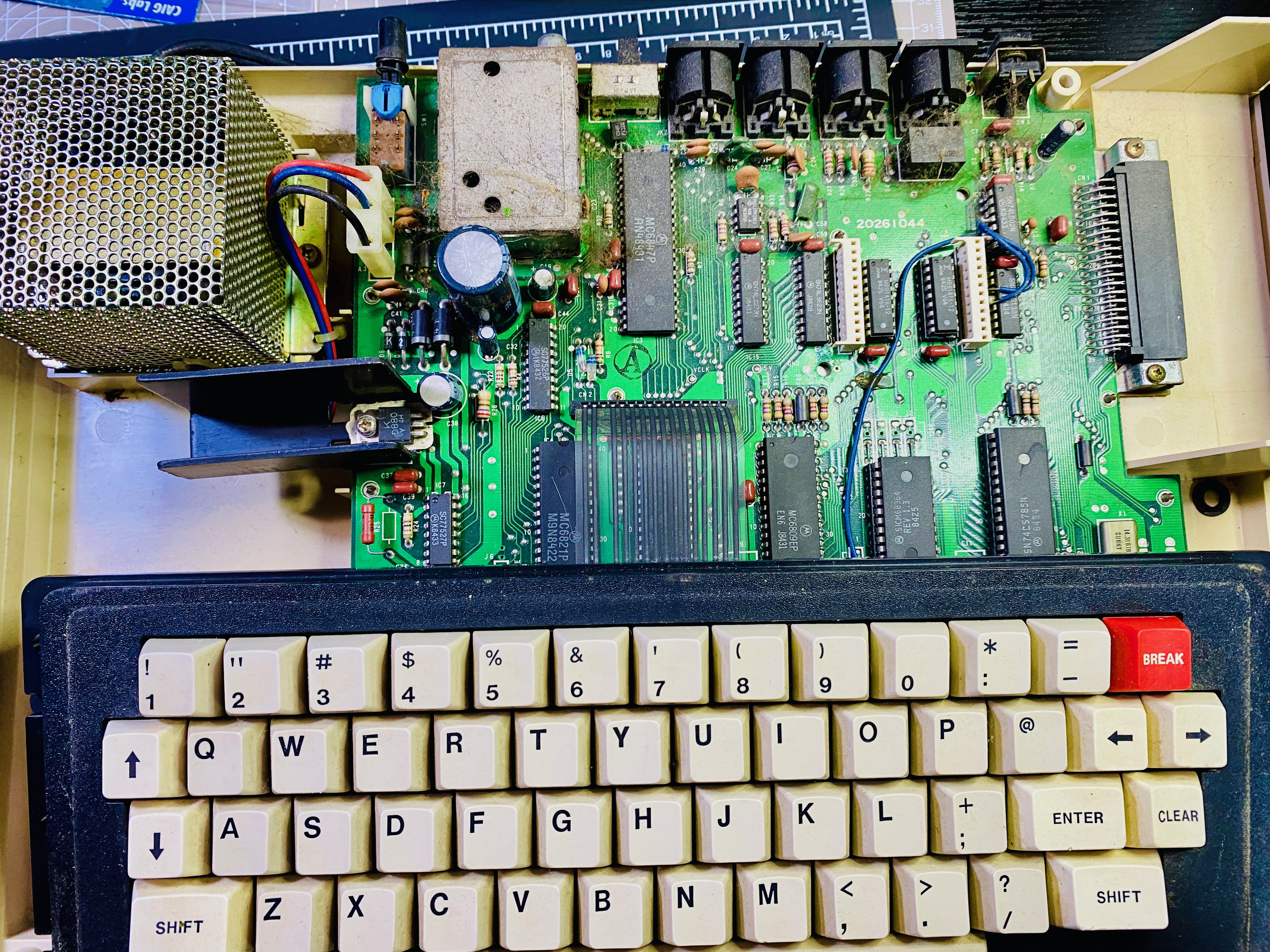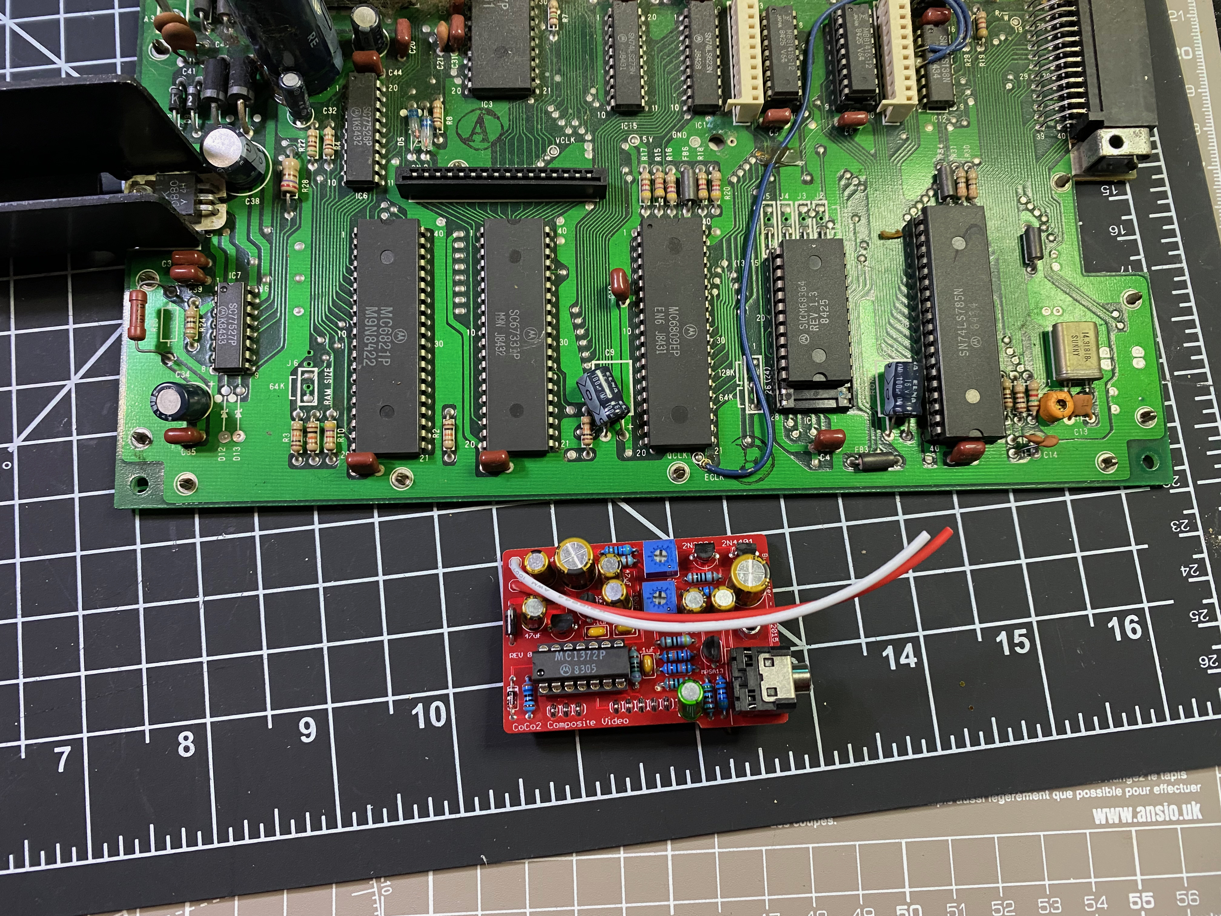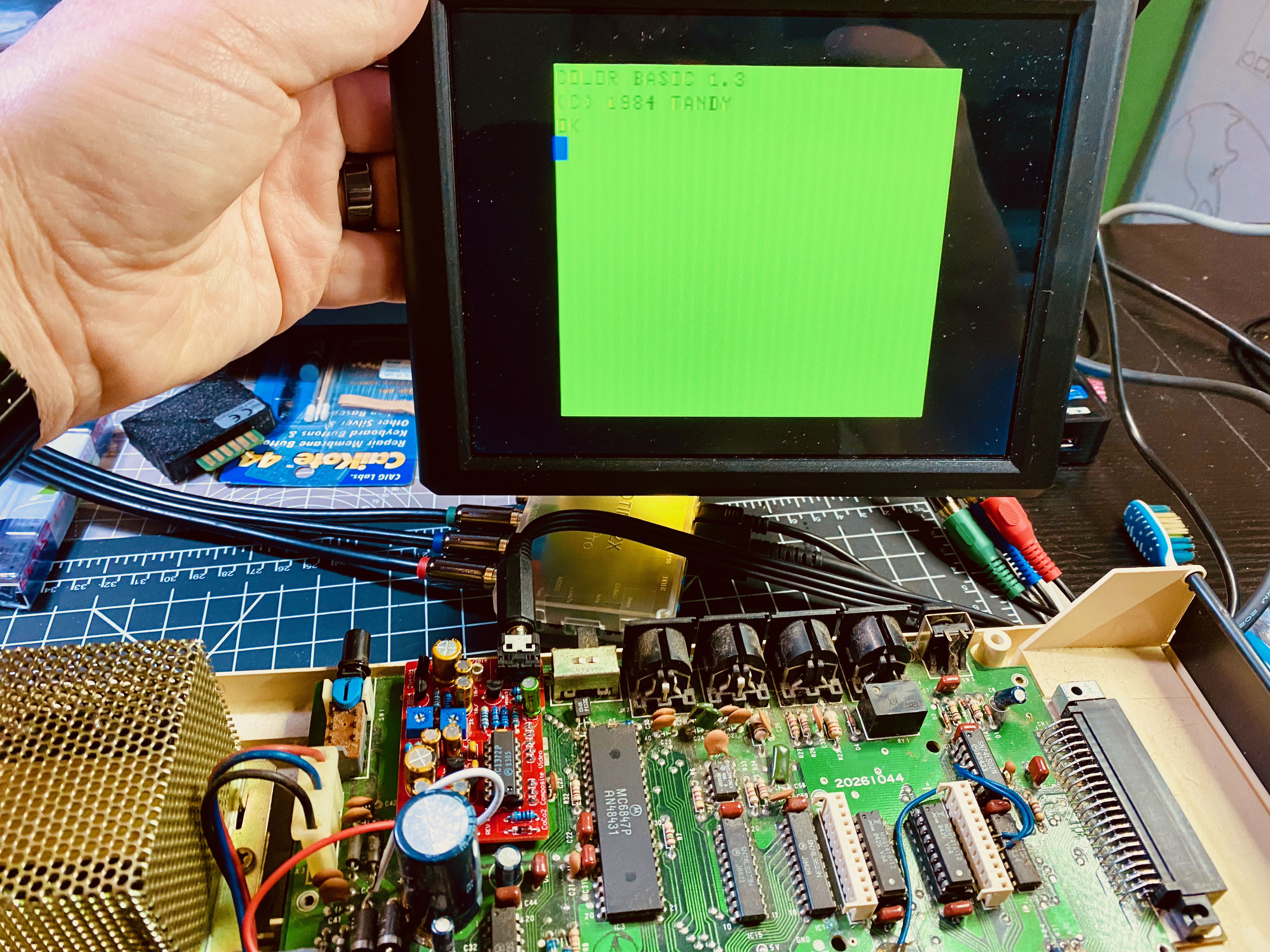 Lunchtime project... Composite video mod on my Coco2. I didn't even blow it up or anything. Haven't used this in many many years, the green is just as horrible as I remember ;-)