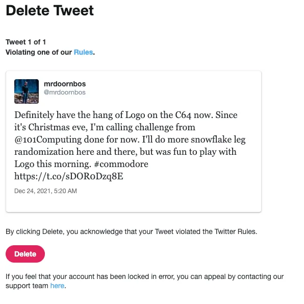 My twitter account was locked for this tweet which contained only a video of my own code. No music, nothing offensive.