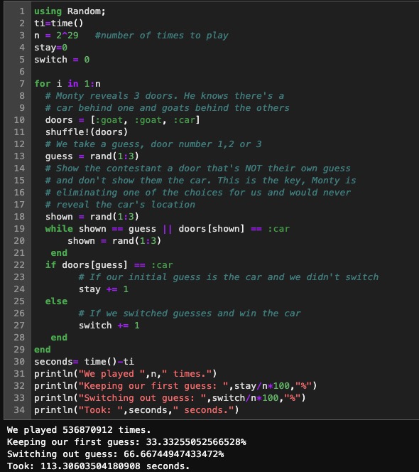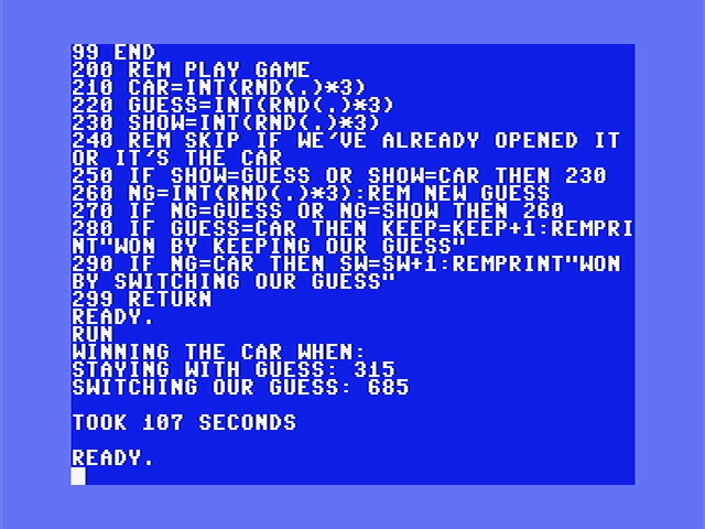 When picking up a new language (Julia this time), I like to solve new problems to get used to it or solve a problem I've solved in another language. Monty Hall will do nicely . Since Julia on an i7 is slightly faster than a 6502, I let the 64 do 1000 and Julia did 2^29 #commodore