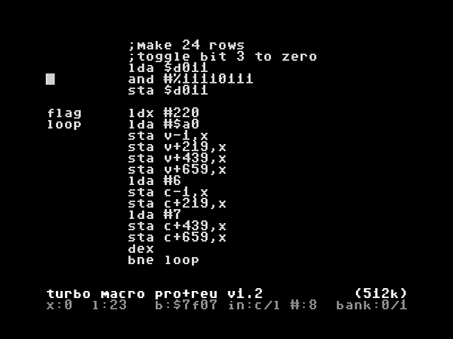 Someone asked me how to make a split color screen on the Commodore 64 in Assembly last night for... reasons. Easiest way I can think of is to squish the screen to 24 rows so the row count is even. #commodore