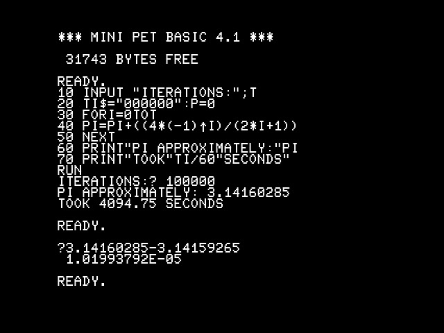 Another one of my favorite ways to estimate pi. The PET did a good job with this one in just over an hour. #commodore