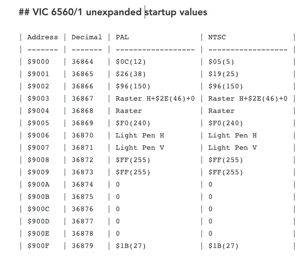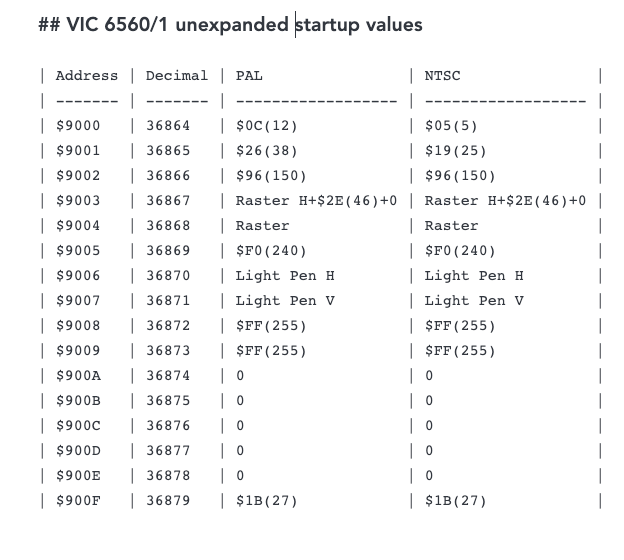 In case you're one of THOSE people who was just sitting there thinking "what ARE the startup values in the VIC chip registers on a VIC-20?" Well, you're in luck. #commodore