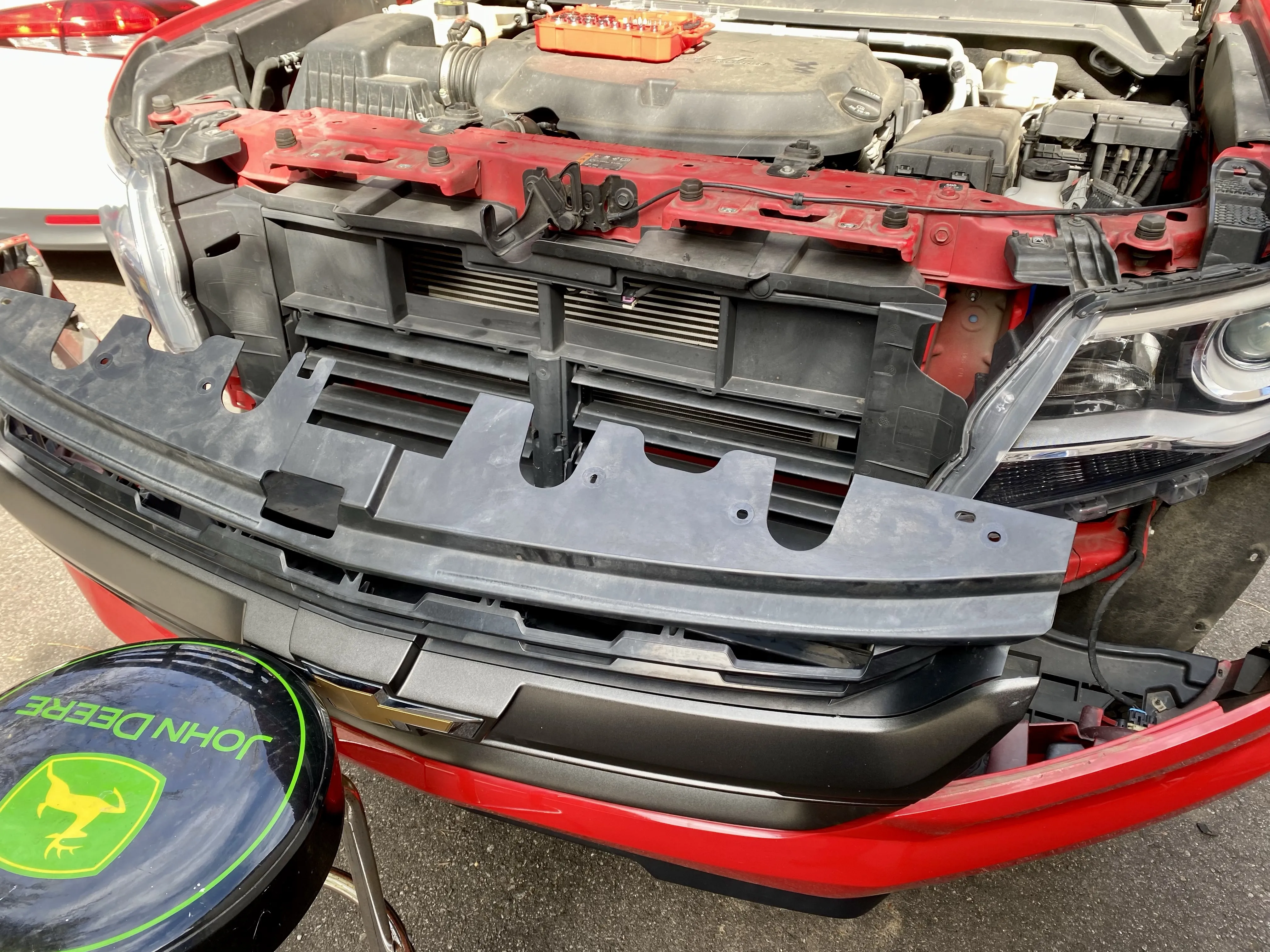 Replacing the broken automatic cooling vane system on my truck. There are 30 fasteners to mostly remove the grille and bumper. Other than a trip to the hardware store because only God knows where my 7mm socket is… 29 of them came off in 30 minutes. This last one…hour and a half