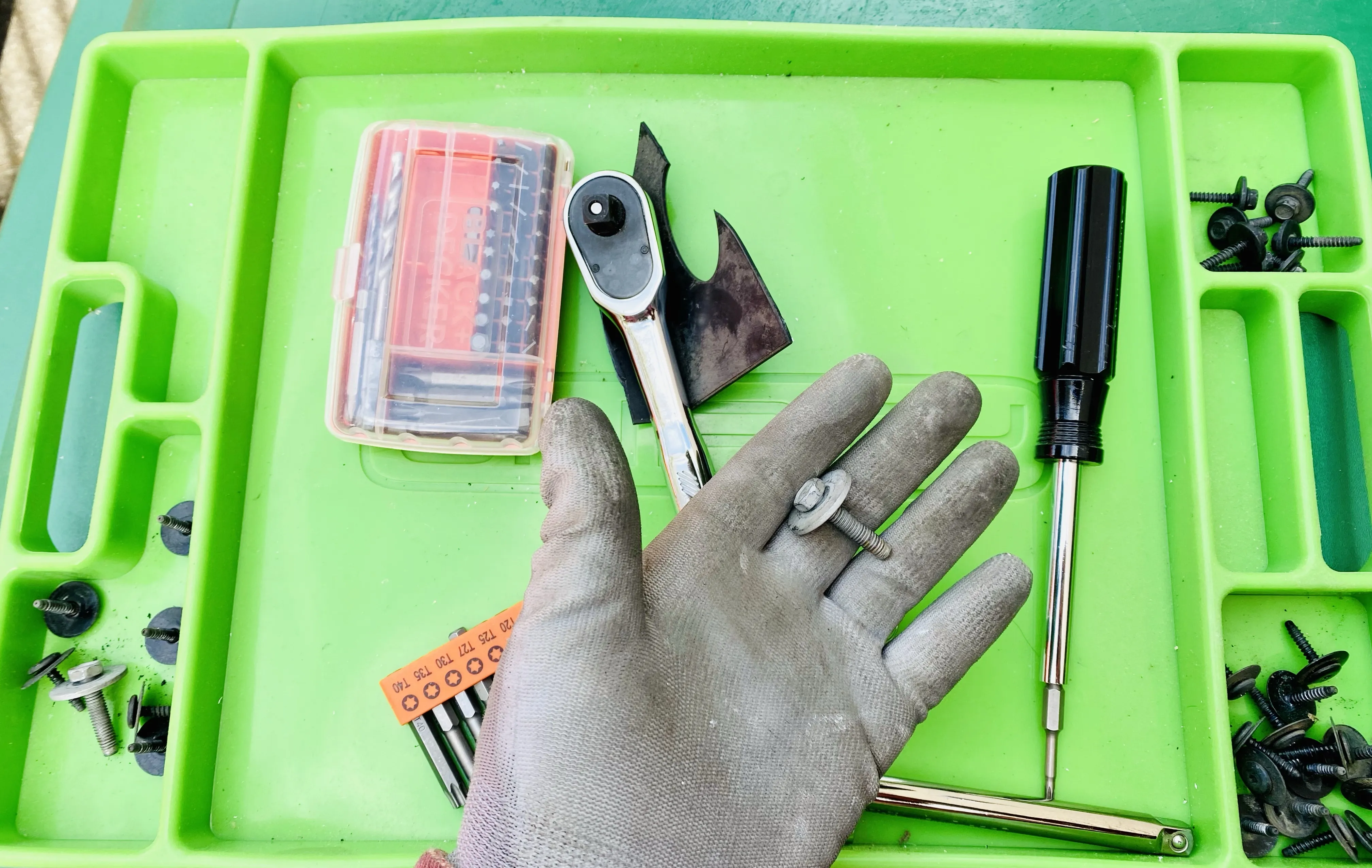 Replacing the broken automatic cooling vane system on my truck. There are 30 fasteners to mostly remove the grille and bumper. Other than a trip to the hardware store because only God knows where my 7mm socket is… 29 of them came off in 30 minutes. This last one…hour and a half