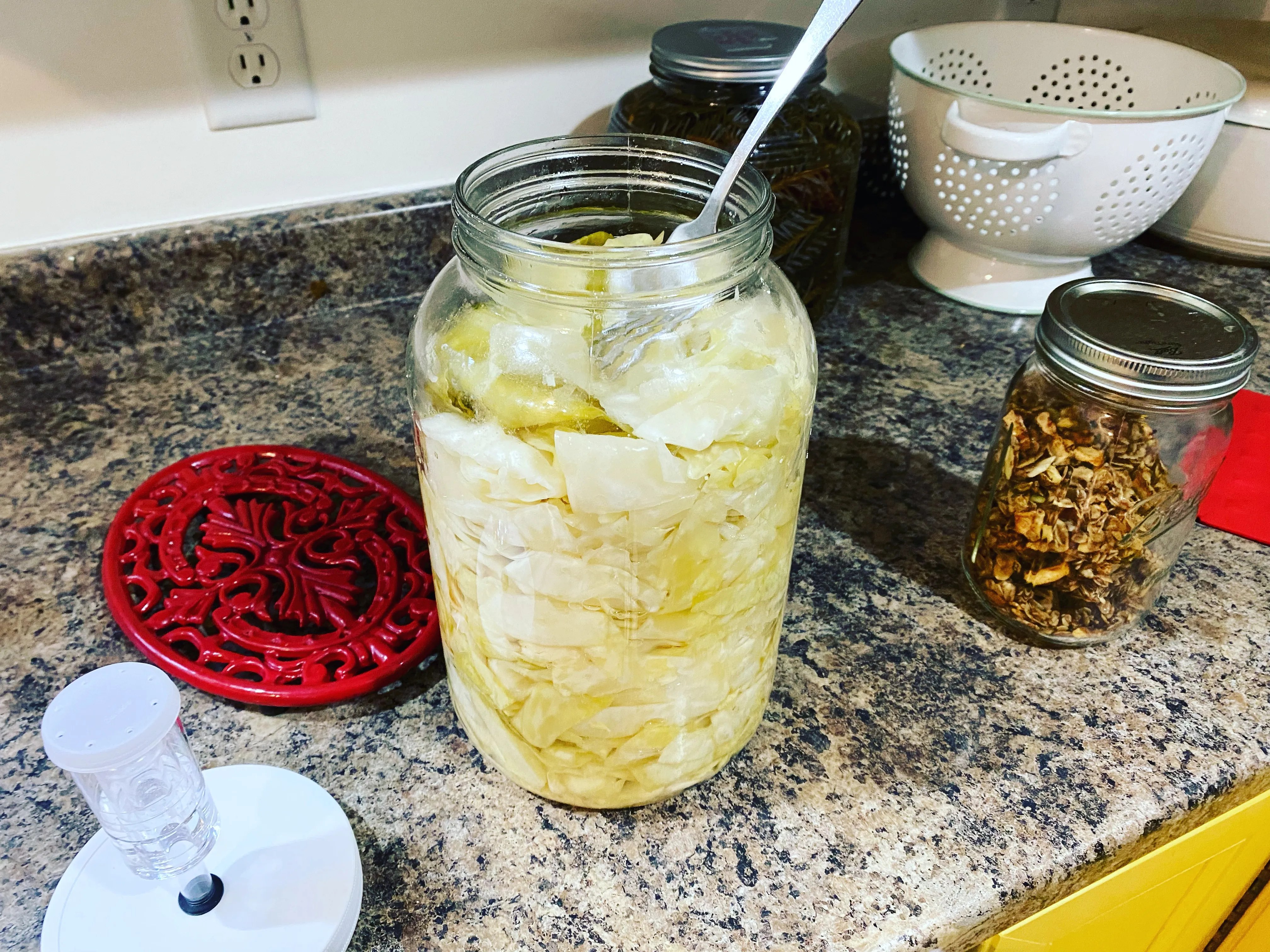 I made a gallon of sauerkraut for 79 cents (that’s a quart jar next to it with granola in it). Add this to the long list of things I don’t buy at the store any more.