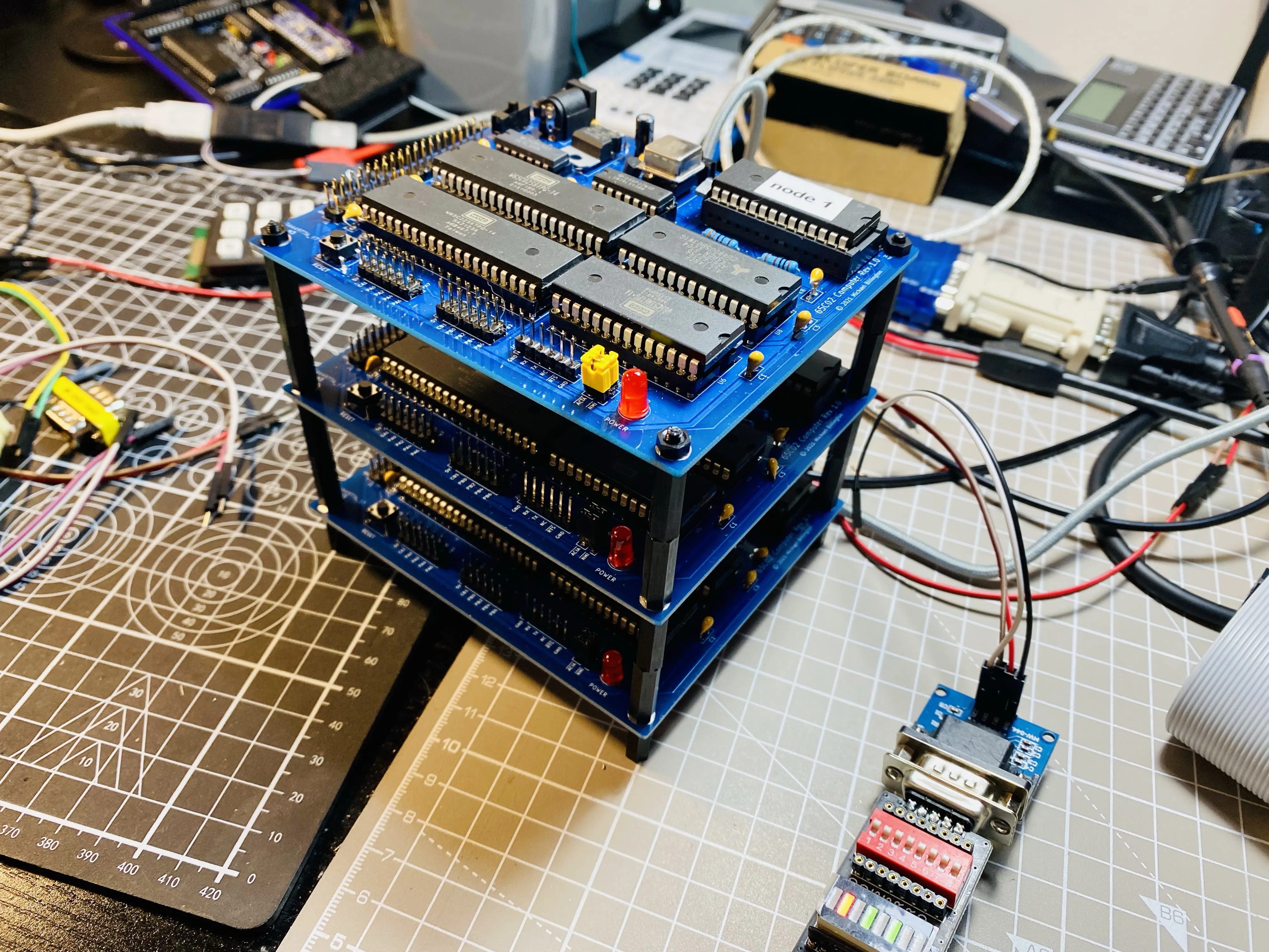 This is turning out even better than I hoped. Three 6502 cluster nodes and their serial multiplexer are now hardware complete + tested on their Commodore 64 controller. Hard part is next: writing software. Is VERY close to cubesat sized so now my brain is whirling about that idea