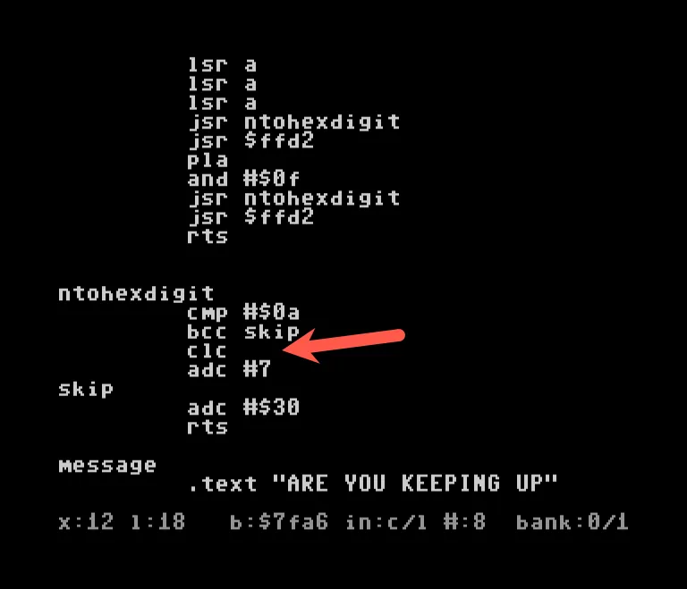 Doing some new cipher stuff and printing my hex values to the screen. Simple enough, but I was getting strange values sometimes. Took me WAY too many Mississippi’s to notice I forgot to clear carry. #facepalm #commodore