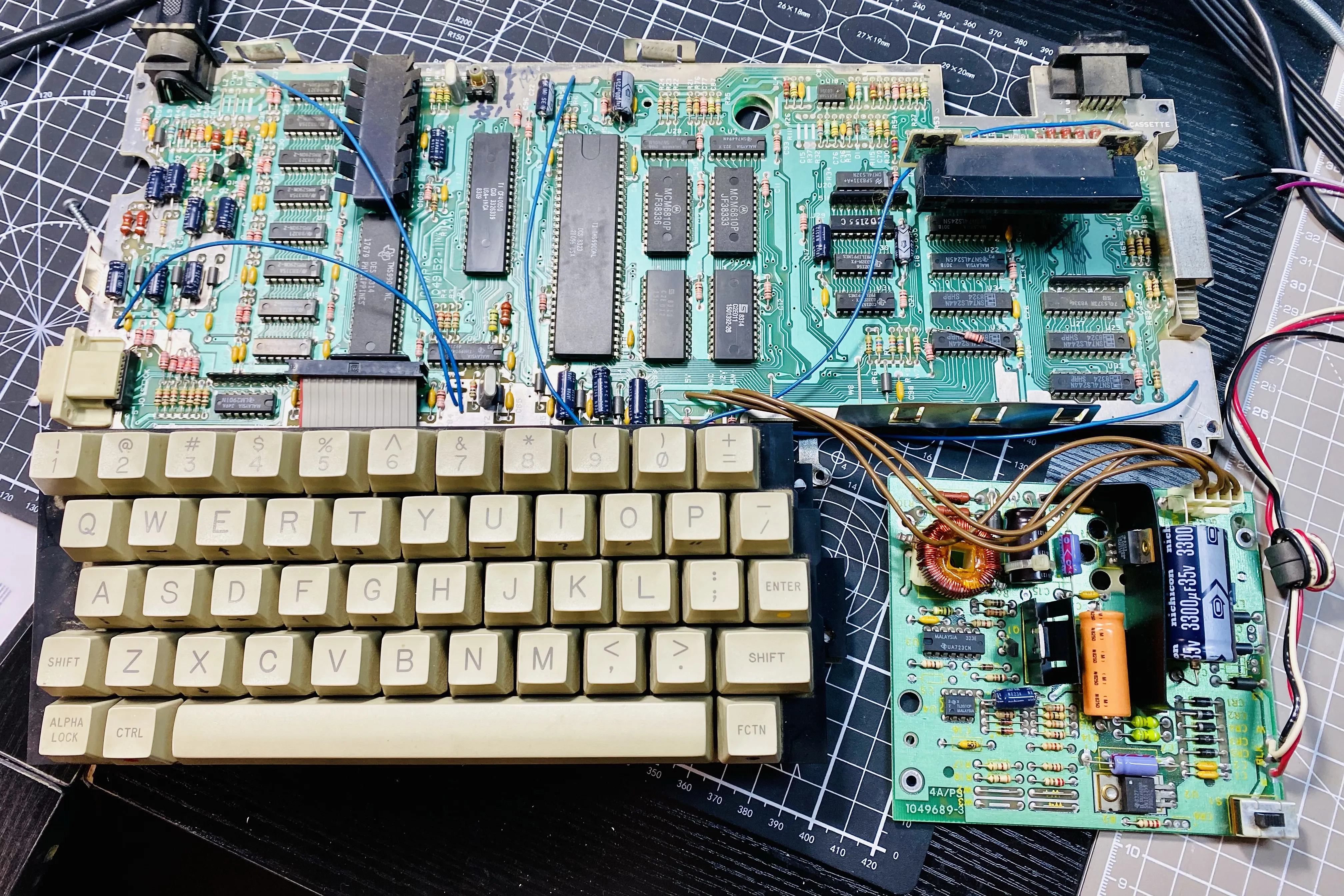 Slowly undressed the TI 99/4a… made bow chica wow wow sounds while I did it. Cassette interface and cartridges don’t work. Time to find some schematics.