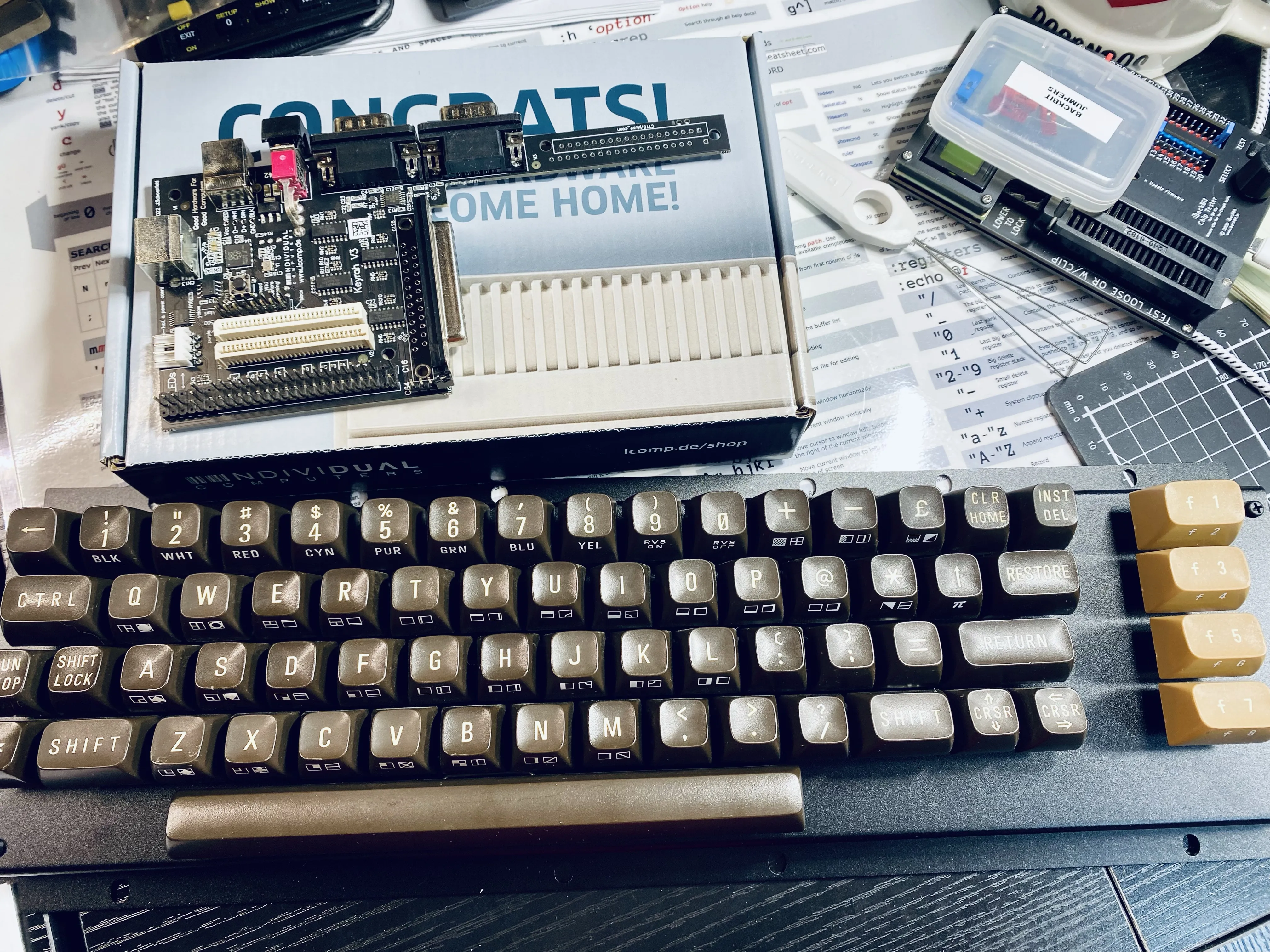 The Mechboard64 does not work out of the box with a KeyRah v3. I did figure out a workaround so I’m going to write up some detailed instructions in case anyone else wants to put these two things together. VIC-20 colored keycaps for me of course.