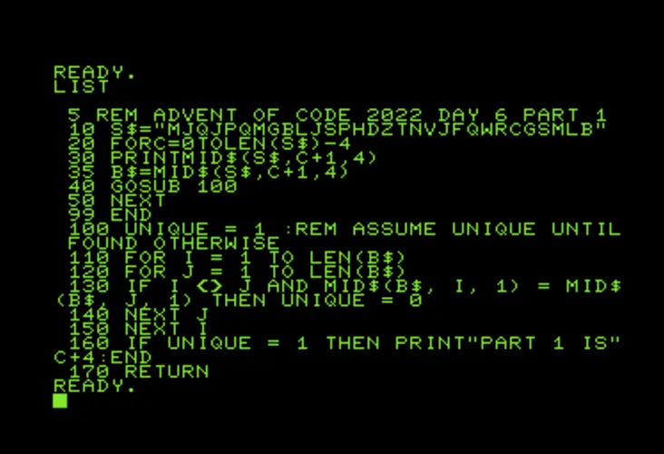 Minor Micro-Soft (yes, 1976 spelling)/Commodore BASIC nitpick. Arrays are zero-based (as god intended), but MID$ is one-based. I mixed up this as a kid and sometimes get tripped up today. Anyway, I'm reviewing my 2022 #aventofcode stuff to prep for Friday.