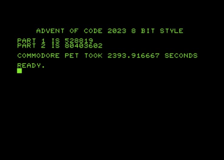8-bit game programmers know how to do today’s #adventofcode2023 conceptually. We spent our youth boundary-checking stuff on a screen represented in contiguous memory. The only “problem” is that the data is 19600 bytes. On the PET I used 0x3000-0x7c90 as my “screen.” Looking for stuff on a 140x140 grid is similar to doing it on a 40x25 grid; it’s just 19x larger. I already had several assembly routines in my toolbox for this one. I could speed this up, but it works. On to trying it in Elixir…