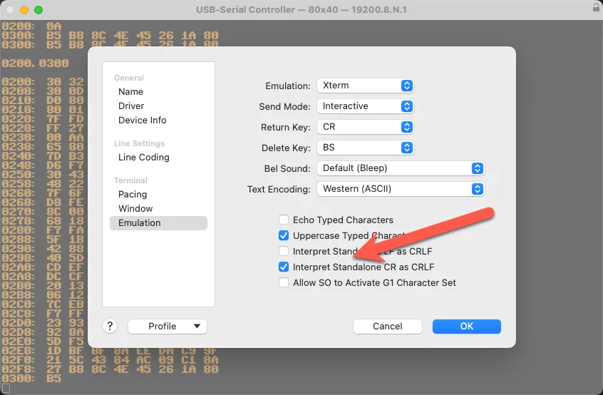 Porting Wozmon to my 6502 cluster nodes and I spent several hours chasing a “bug” in my code. Turns out I had this box unchecked in my terminal emulator. Was working all along. Doh.