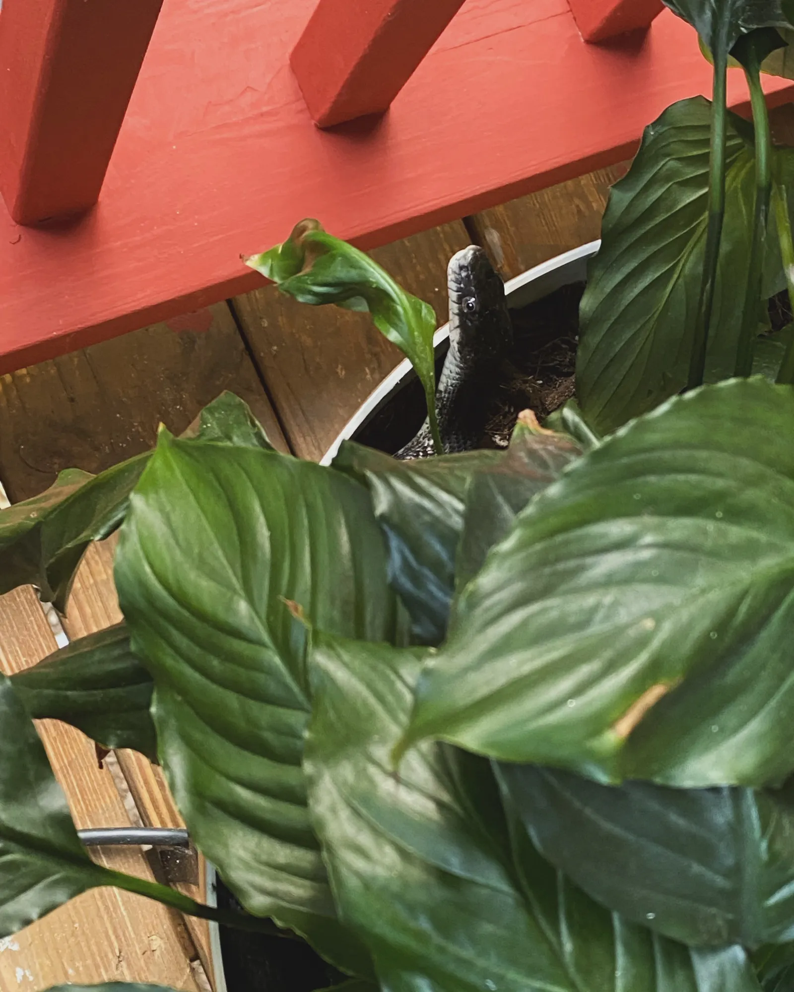 What’s interesting about this little guy hanging out in this pot is that it’s on our upper porch deck about 15 feet off the ground. Didn’t expect to see him there.