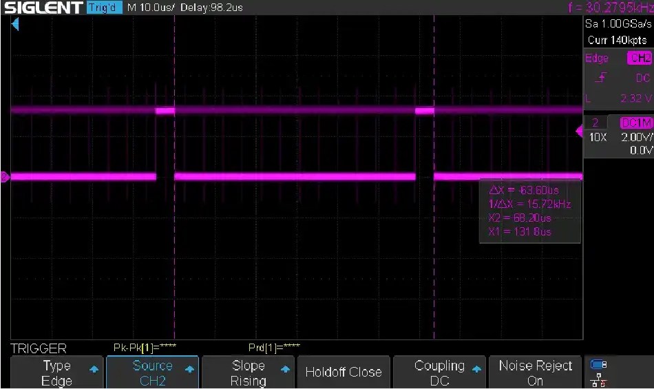 Well, this is a good start. I decided to write the Verilog over on the project from scratch. That’s a decent NTSC HSync and VSync signal so far.