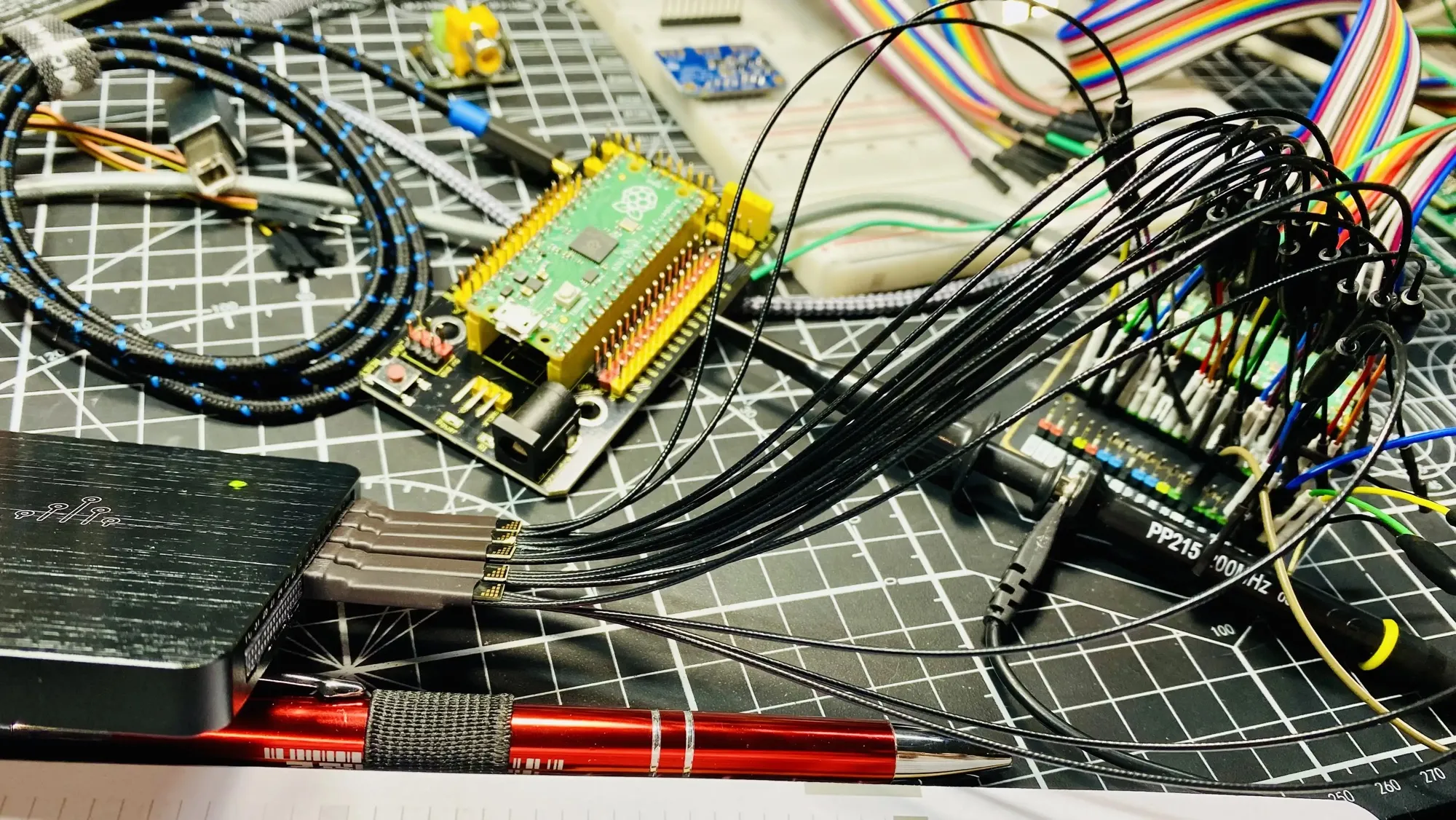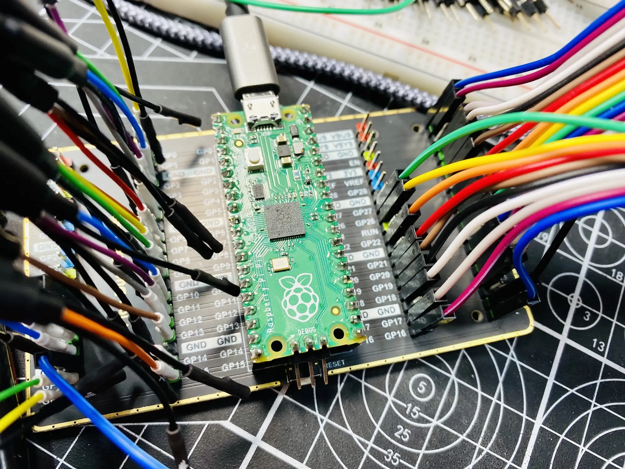 This Pico breakout board mirrors every pin. One side is my I/O connections and I’ve got the mirrors connected to my logic analyzer. Kinda great.