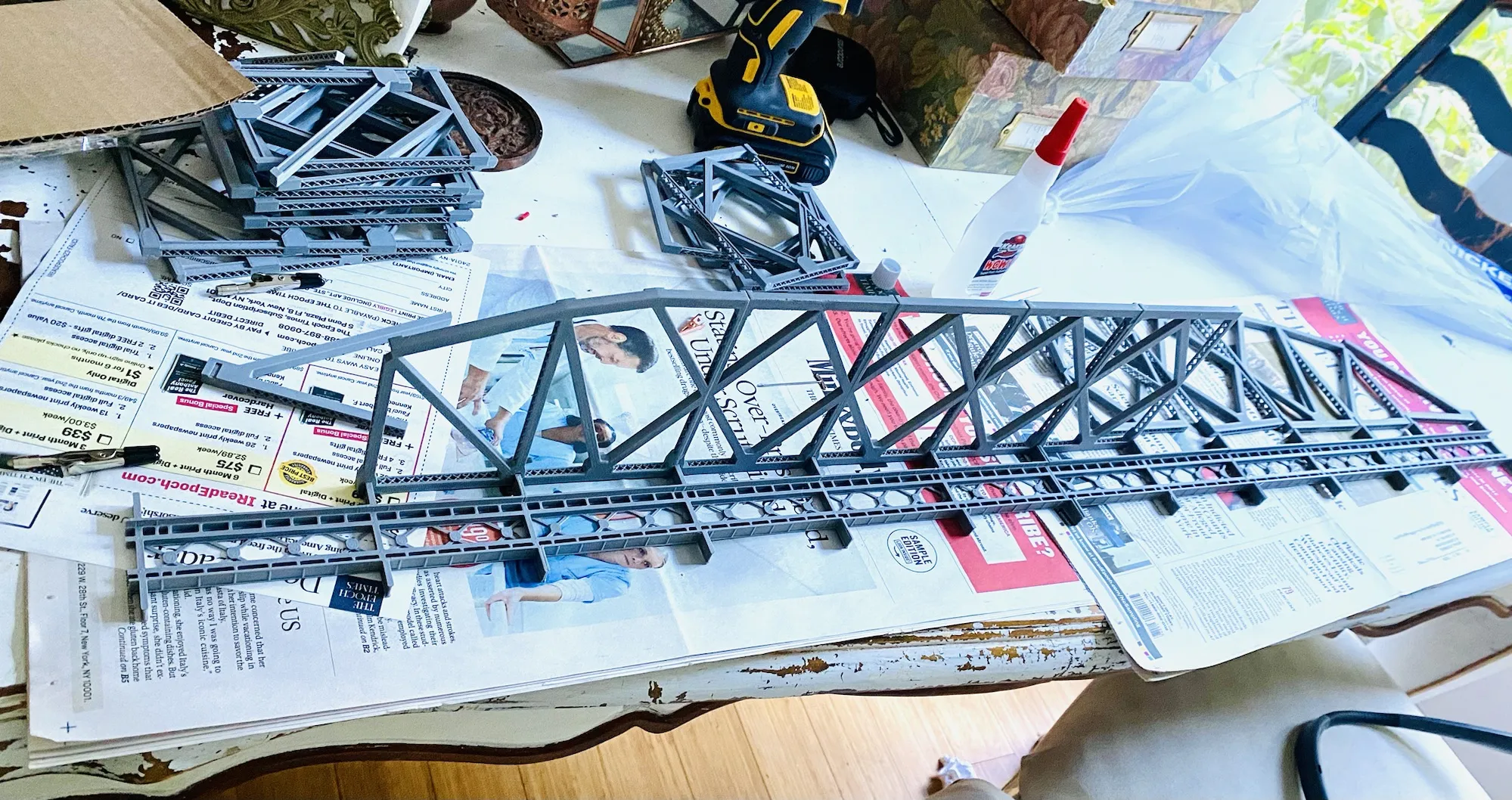 She’s doing the gingerbread houses and I’m doing the train. Need to span a 42”(107cm) section over the window. Now that I’m building the bridge I’m realizing how big that span is. To scale (HO) this would be about 305 feet (93 m). Coming together nicely so far.