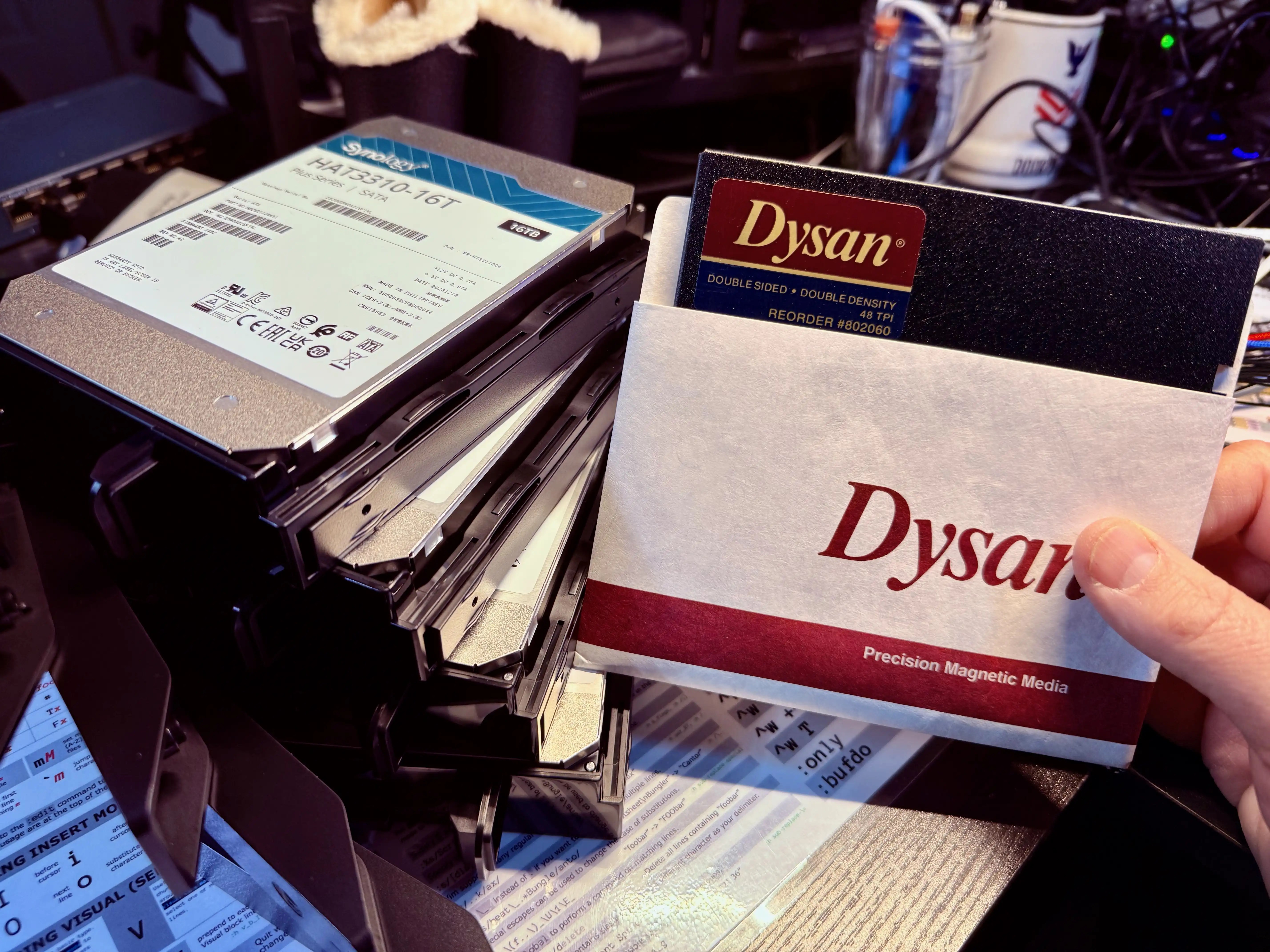 Putting four 16 Terabyte drives in a NAS. Here’s a double-sided, double-density 5.25 floppy disk for scale.