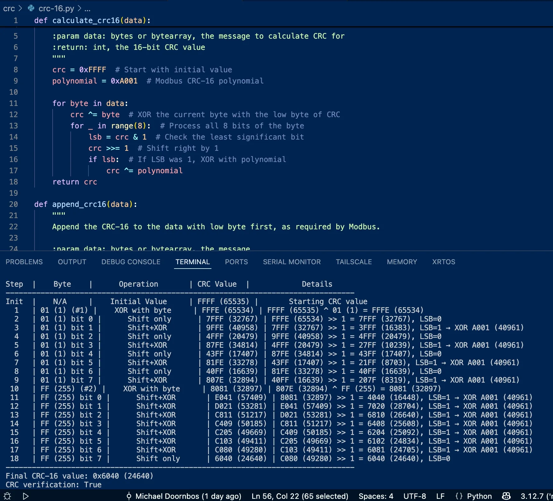 Modbus CRC-16 for "work"